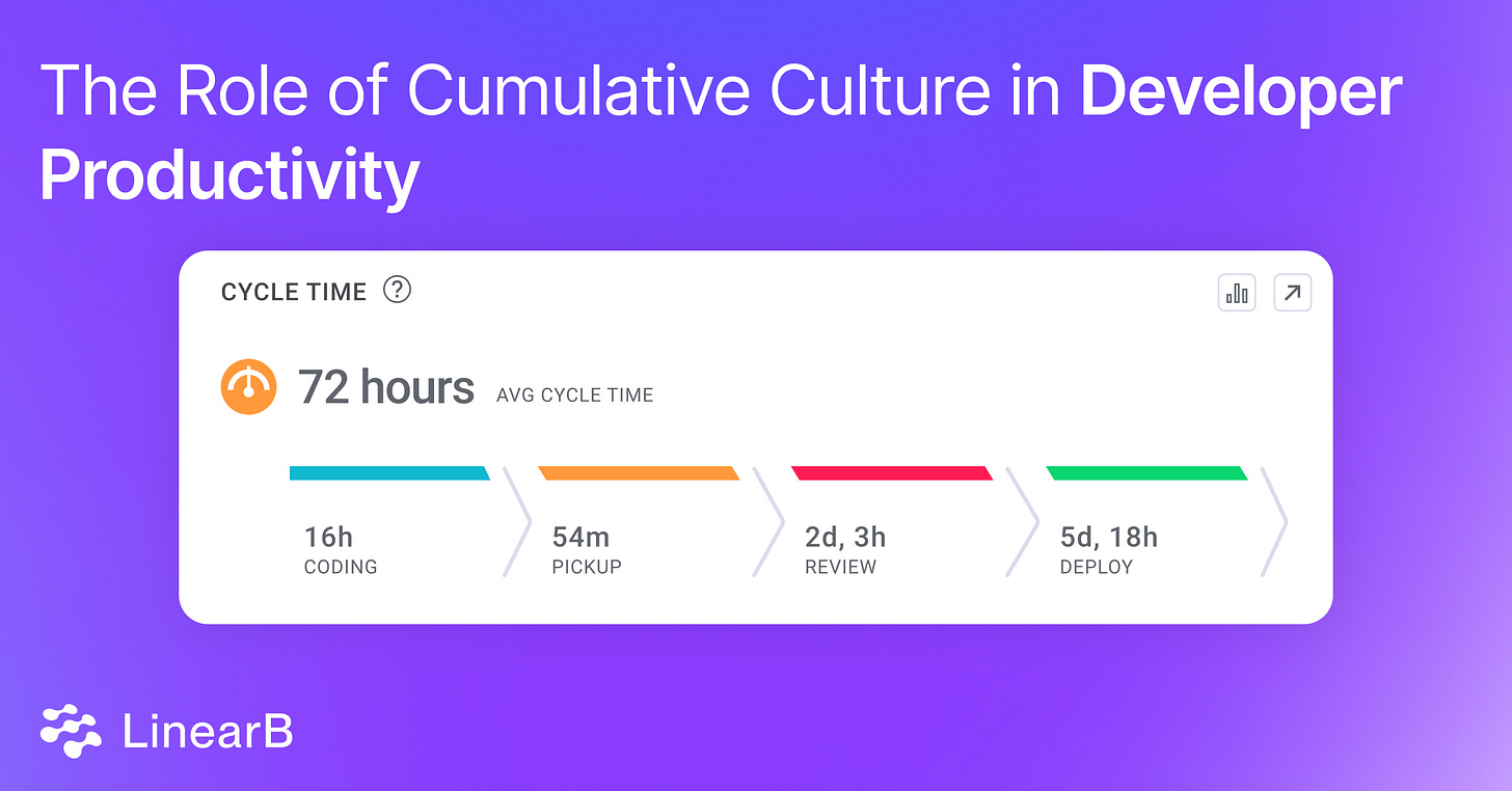Developer productivity isn’t just about commits or lines of code—it’s about how teams build on collective knowledge to solve problems and innovate together. In this week’s blog, LinearB dives into cumulative culture theory, showing how social learning and collaboration are the real drivers of success in software development. Ready to level up your team’s productivity?